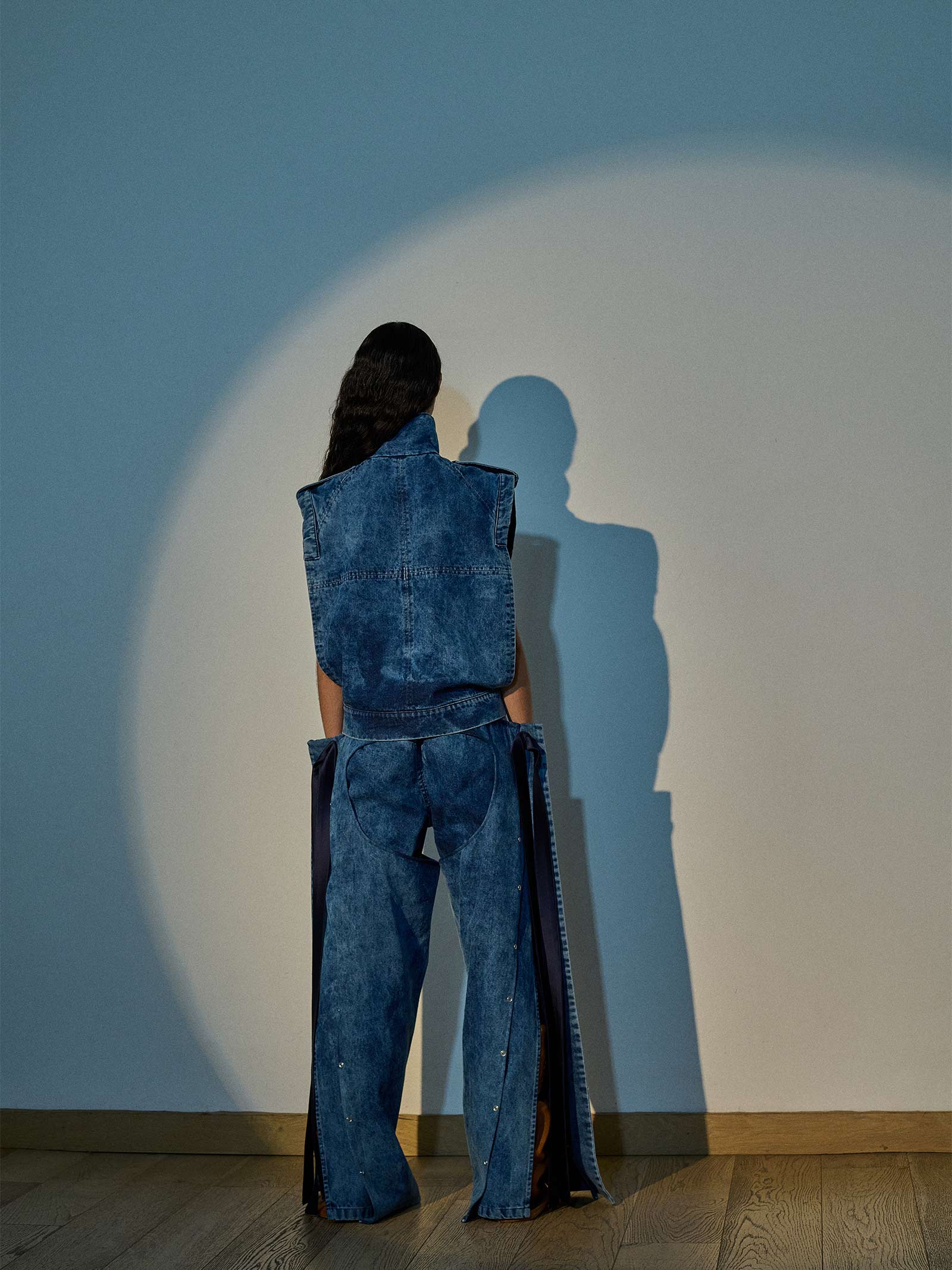 Denim vest with a high collar, zipper closure, front pockets, and shoulder detailing.