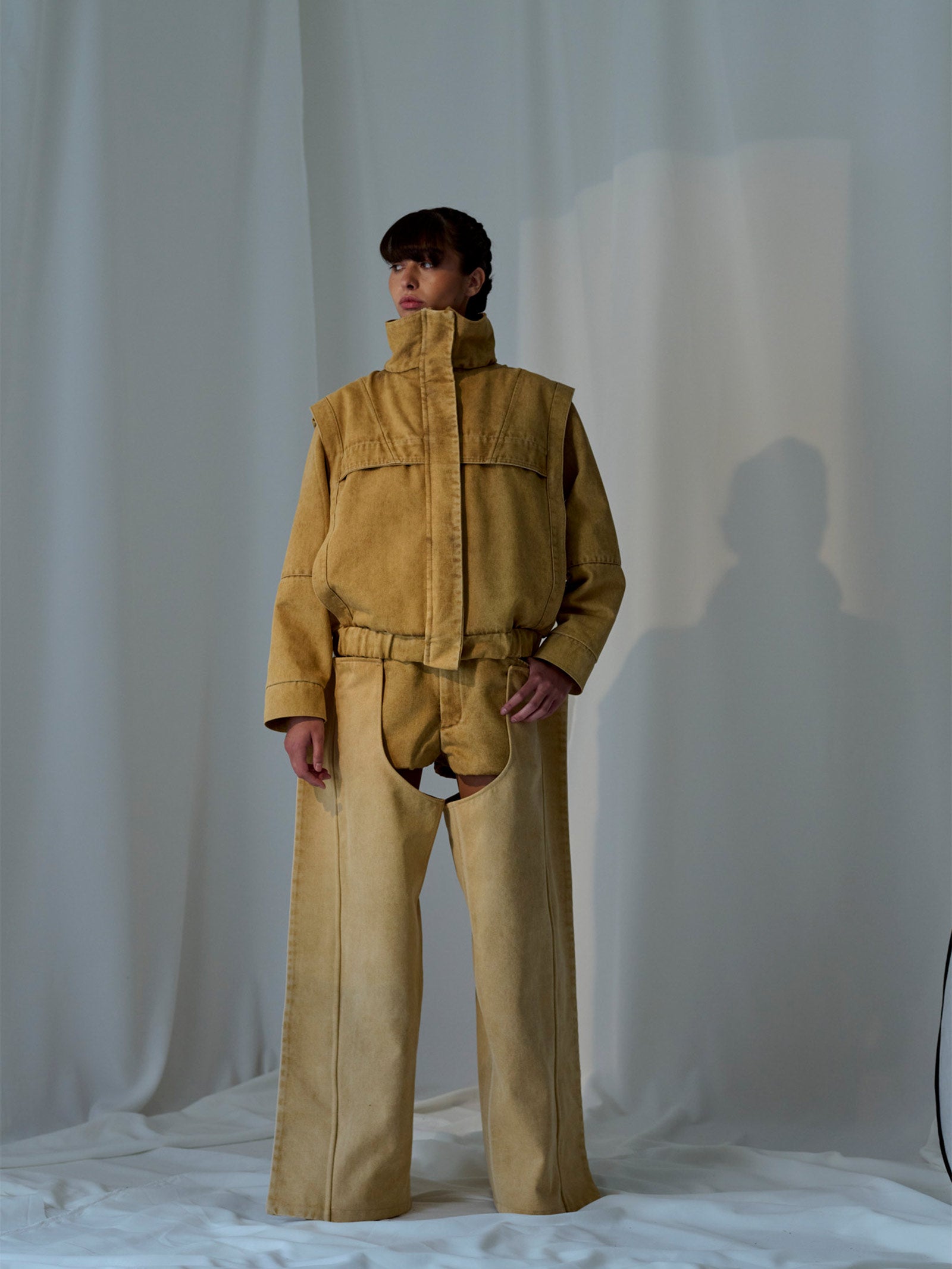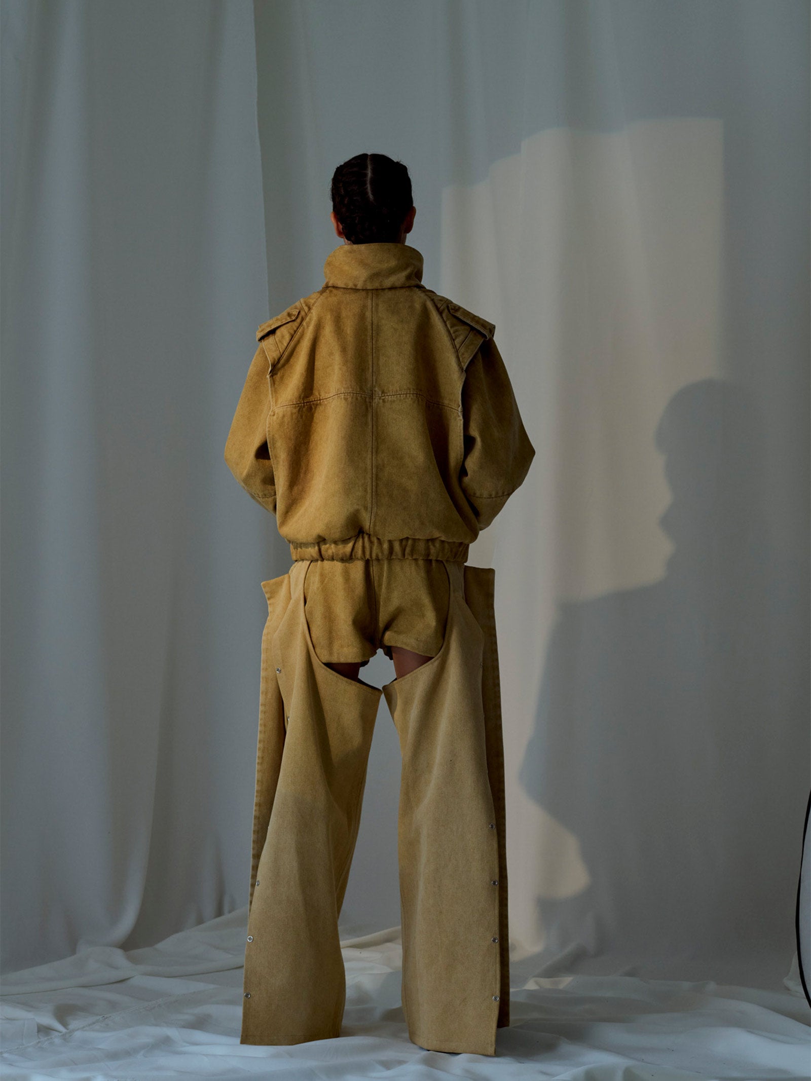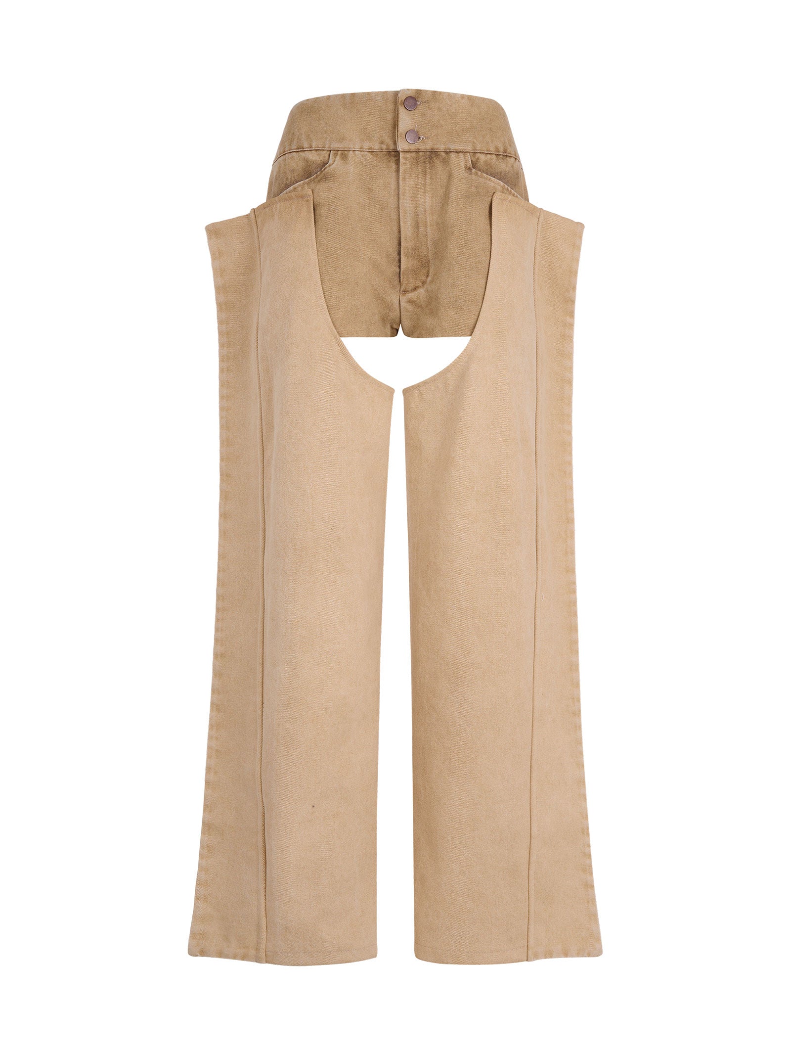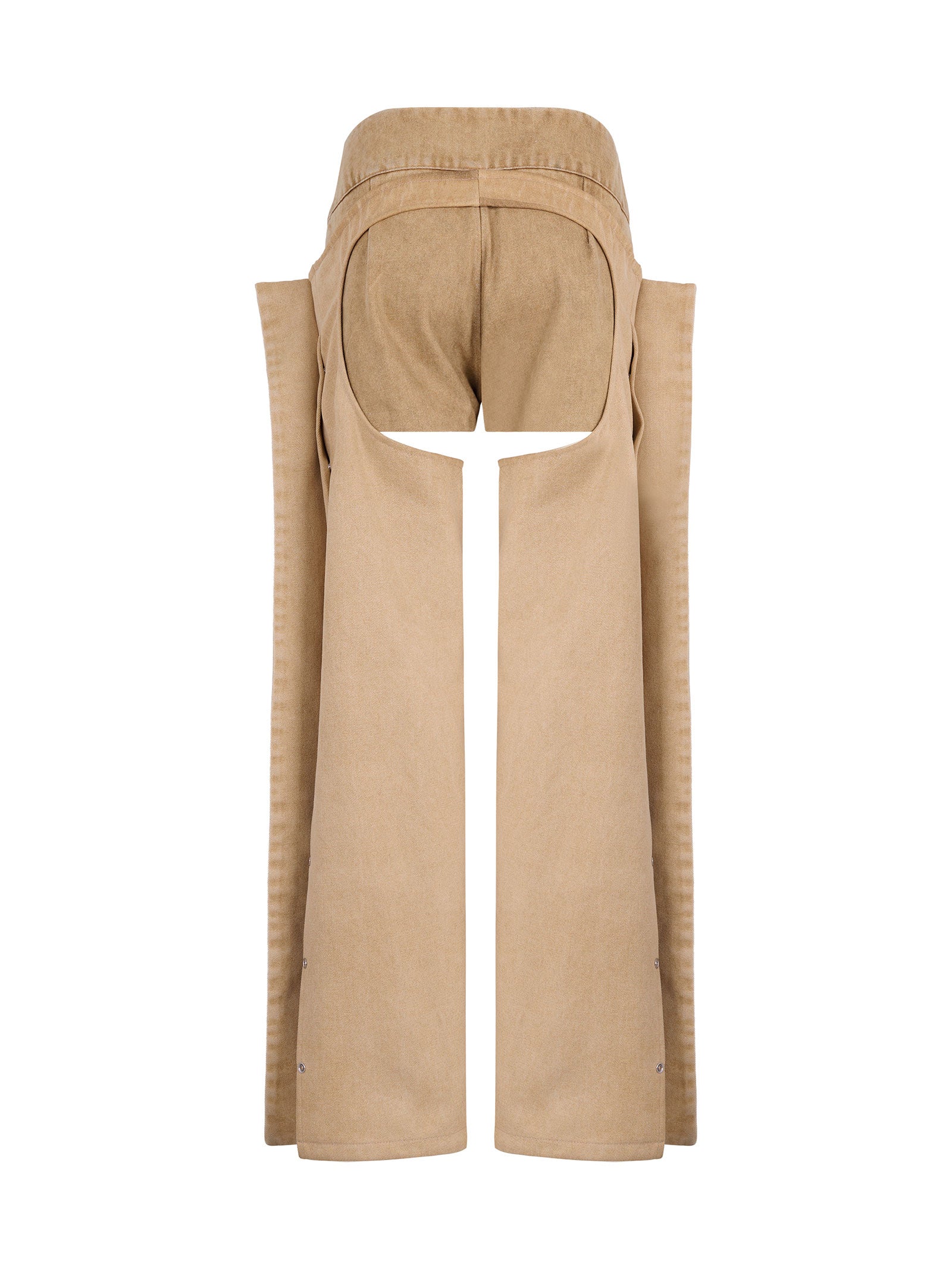 Charro-inspired denim shorts with a wide waistband and two buttons, openings around the leg as seams, and side detailing.